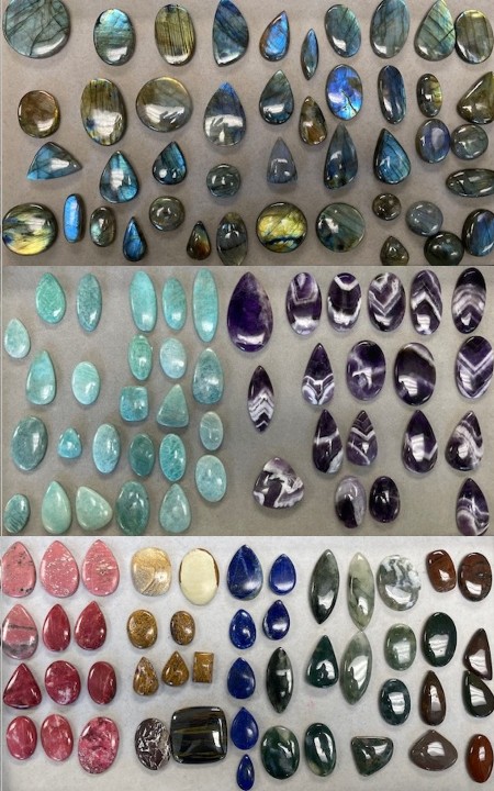 These unique cabs are available in store online. If online customers are interested, we can send photos of what is available at the time of your request. Stunning labradorite, amazonite, amethyst, lapis, thulite. moss agate, bloodstone and miriam jasper.